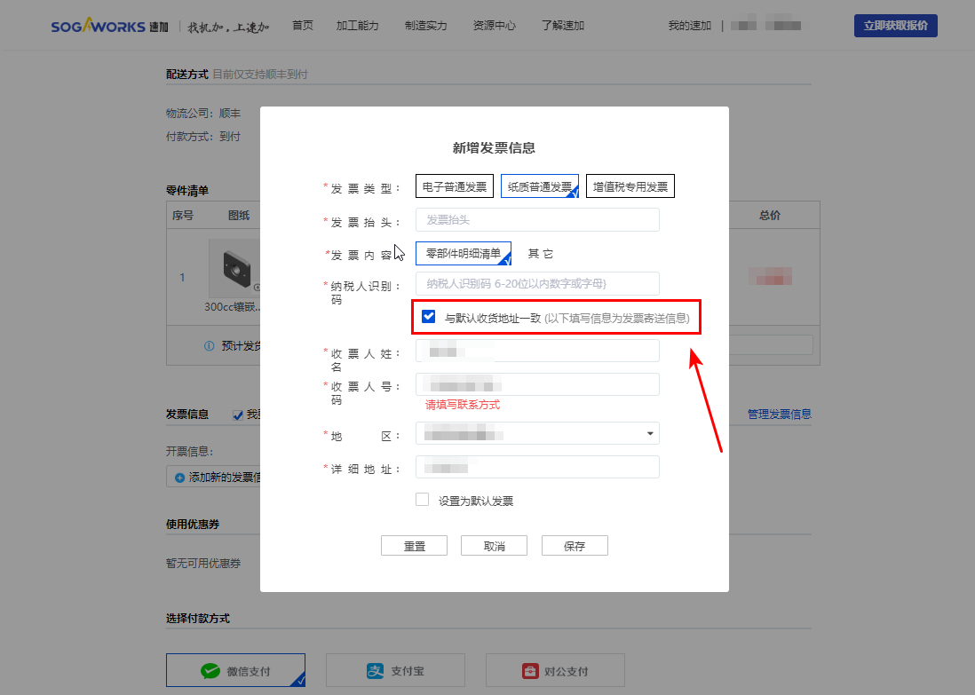 6.2.1 如您勾選【與默認收貨地址一致】,則您的發(fā)票將會隨貨發(fā)出