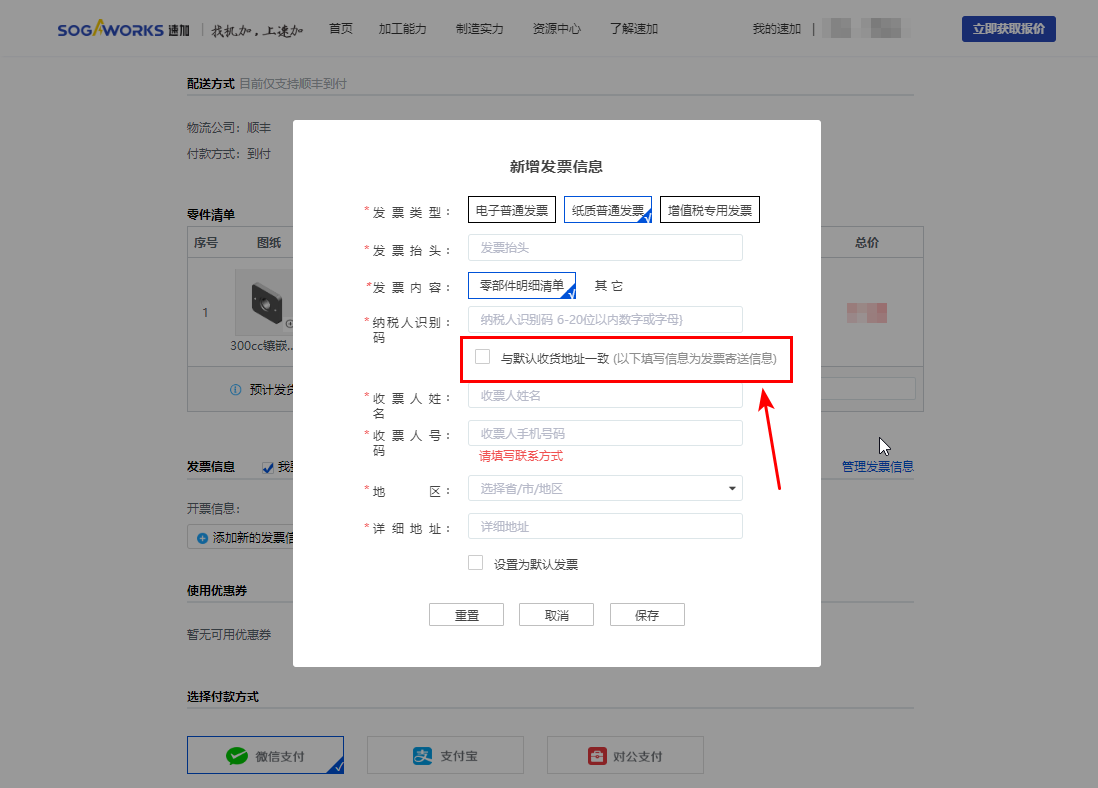 6.2.1 如您勾選【與默認收貨地址一致】,則您的發(fā)票將會隨貨發(fā)出