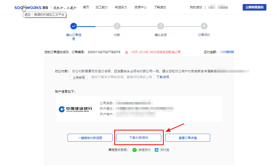 7. 點擊【下載付款資料】,可獲取對公轉(zhuǎn)賬信息